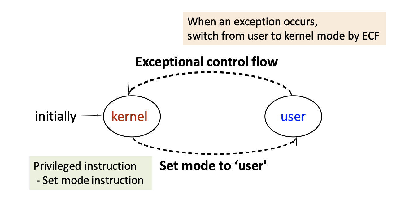 - zero division 등이 존재해. 이러한 프로그램의 상태가 아닌 시스템의 상태로 인한 컨트롤 플로우는 exception을 발생 시켜 핸들을 해. 이 플로우는 우리는 Exceptional Control Flow (ECF) 라고 불러. 이 ECF에서는 어떤 이벤트가 예외를 발생시켰는지 (exception number), 어떻게 예외를 처리할지 (exception handler), 그리고 어떻게 exception handler 로 점프하고, 원래 플로수로 복귀할지 에 대한 작업을 처리해.