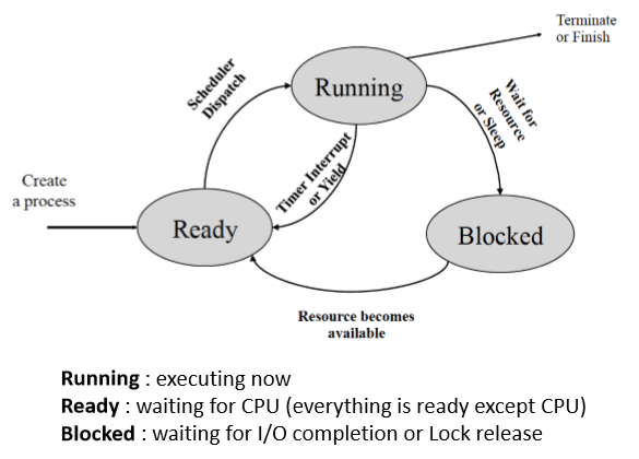 - I/O or event completion 위와 같은 상황에서 상태 전이가 일어나
