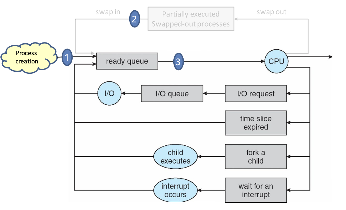 스케줄러에 대한 자세한 내용은 다음 글에서 다루도록 하고, 스케줄러의 종류에 대해서 알아보자. short-term scheduler 는 밀리초 단위로 ready queue 에서 어떤 프로세스를 받아올지 결정하는 스케줄러야. long-term scheduler 는 초나 분 단위로 느리게 호출되고, 생성된 프로세스를 레디큐에 넣는 순서에 대해서 결정을 해. 이러한 long-, mid-term scheduler 는 CPU-bound 와 I/O-bound 맞추기 위해 존재해. I/O-bound process 란 입출력에 시간을 더 많이 쓰는 프로세스고, CPU-bound 는 연산에 시간을 더 많이 쓰는 프로세스야. 극단적인 케이스로는 I/O-bound process 만 있다면, ready_list 가 전부 놀고 있을 테고, CPU-bound 라면 I/O queue 가 계속 비어있을 것이다.