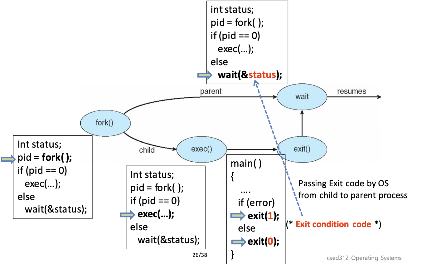 포크는 왜 사용하는가? 포크는 현재 프로세스의 사본을 새 프로세스를 만든다. 부모 프로세스의 address space 를 복사해 자식 프로세스를 만들어. 이때, 현재 코드, 데이터 스택과 OS 상태를 복사해가. 하지만 최적화 측면에서 code는 같을 것이므로 공유하고, 데이터는 쓰기가 발생할때 복사해가는 방법도 있어. 부모는 자식의 pid를 받고, 자식은 0을 받게 된다. 포크를 사용하게 되면, 자식을 만들기 위해 해야하는 것들 (fd 설정, 네임스페이스 수정, 기타 등등) 없이 현재 프로세스의 사본을 만든다는 점이 장점이다. 따라서, create 하는 대신 fork + exec 로 해결할 수 있어.