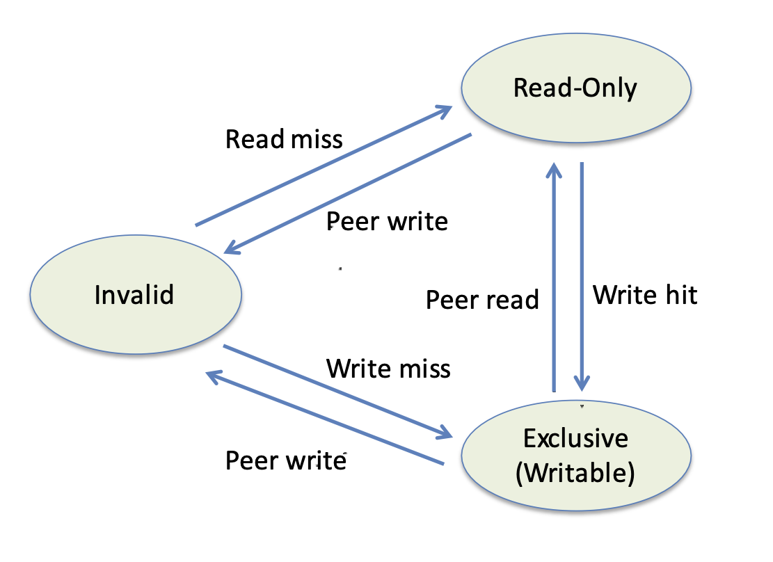 현재 사본이 invalid 상태일때, read miss 일경우 메모리에서 최신 사본을 read-only 상태로 떠오고, write miss 일 경우 writable 상태로 떠온다. Read-only 상태의 캐시일 경우, peer 캐시에 쓰기가 발생하면 더이상 최신 사본이 아니므로 invalidate, write hit 일경우 쓰기 위해 writable 로 간다. 만약 writable 일 경우, peer 가 쓰여진다면, 마찬가지로 최신 사본이 아니므로 invalidate, peer 가 읽히면, read-only 상태로 간다.