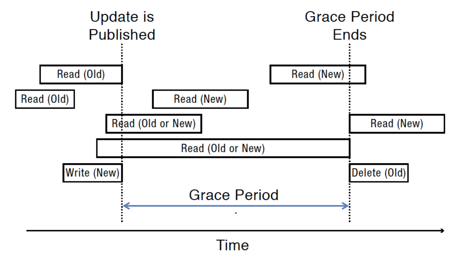 RCU는 공유데이터에 대한 읽기가 intensive 하게 벌어질때 쓰는 방법이다. 읽기를 수행할 때, 락 확보 없이 바로 들어가서 읽는다. 데이터에 대한 쓰기가 발생하면, 새로운 버전의 카피를 만들어 놓고, atomic instruction 으로 새 버전으로 한번에 배포한다. 따라서 시스템 내에는 여러 버전의 파일이 존재 할 수 있다. 또한, 스레드 스케쥴러와 함께 작업을 해야하는데, 모든 읽기 스레드가 grace period 안에 끝나는 것을 보장해야하고, 이 기간 이후에 outdated 된 버전들을 폐기한다.